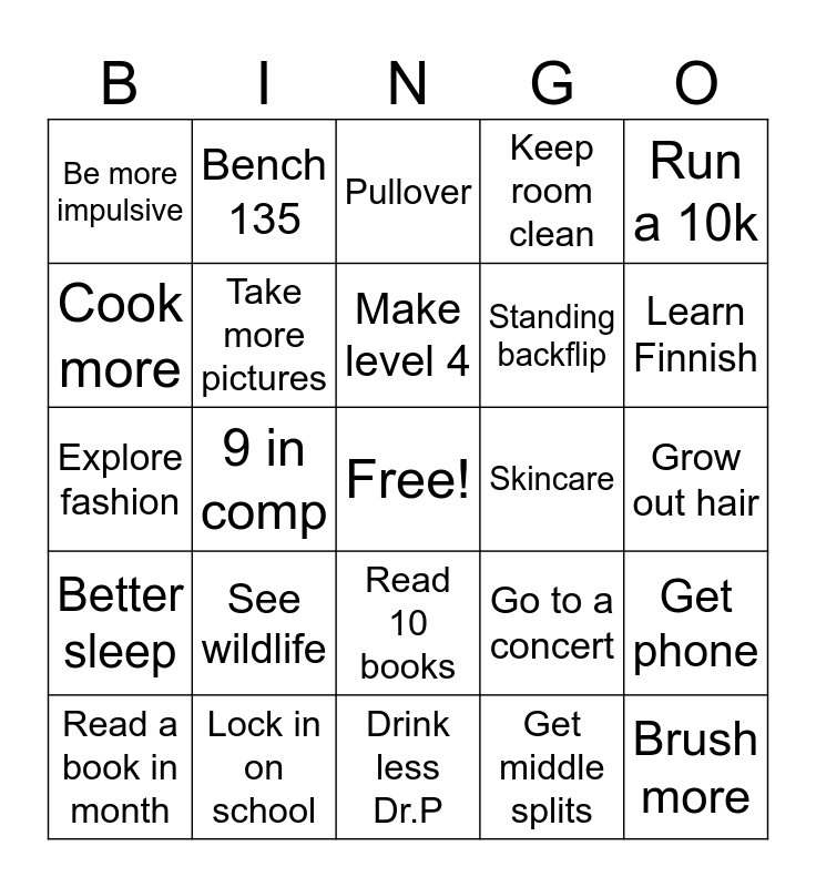 This bingo card has a free space and 24 words: See wildlife, Lock in on school, Make level 4, Read a book in month, Run a 10k, Be more impulsive, Cook more, Bench 135, Skincare, Read 10 books, Standing backflip, Explore fashion, Go to a concert, Get phone, Take more pictures, Get middle splits, Grow out hair, Pullover, Learn Finnish, 9 in comp, Brush more, Better sleep, Keep room clean and Drink less Dr.P.