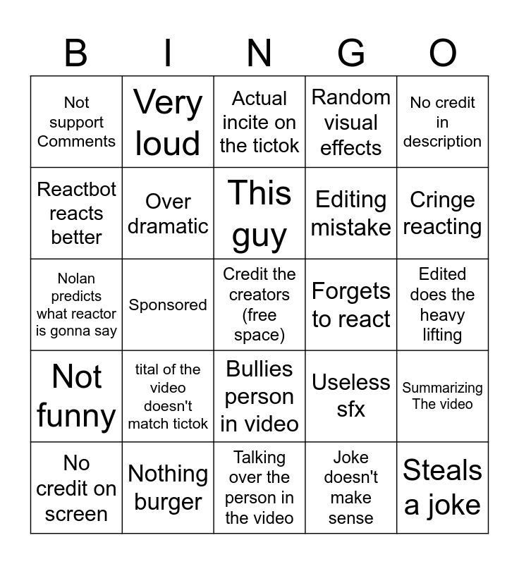 This bingo card has a free space and 24 words: tital of the video doesn't match tictok, Nothing burger, This guy, No credit on screen, No credit in description, Not support Comments, Reactbot reacts better, Very loud, Forgets to react, Bullies person in video, Editing mistake, Nolan predicts what reactor is gonna say, Useless sfx, Summarizing The video, Over dramatic, Joke doesn't make sense, Edited does the heavy lifting, Actual incite on the tictok, Cringe reacting, Sponsored, Steals a joke, Not funny, Random visual effects and Talking over the person in the video.