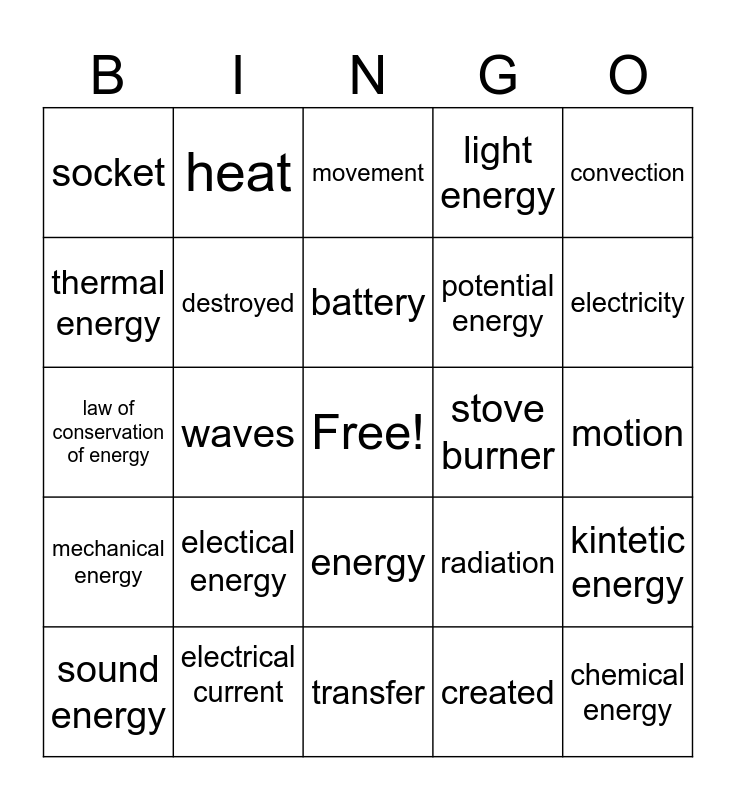 This bingo card has a free space and 24 words: electical energy, electrical current, battery, sound energy, convection, socket, thermal energy, heat, stove burner, energy, potential energy, law of conservation of energy, radiation, kintetic energy, destroyed, created, motion, movement, electricity, waves, chemical energy, mechanical energy, light energy and transfer.
