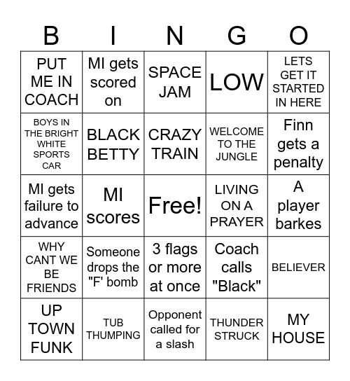 This bingo card has a free space and 61 words: TNT, TUB THUMPING, BAD BOYS, WHY CANT WE BE FRIENDS, THUNDER STRUCK, LOSE YOURSELF, BLACK BETTY, STRONGER, WELCOME TO THE JUNGLE, BACK AND BLACK, LOW, WE ARE THE CHAMPIONS, BOYS IN THE BRIGHT WHITE SPORTS CAR, EYE OF THE TIGER, HUMBLE, PUT ME IN COACH, MY HOUSE, LETS GET IT STARTED IN HERE, TURN DOWN FOR WHAT, CRAZY TRAIN, LIVING ON A PRAYER, SPACE JAM, UP TOWN FUNK, BELIEVER, D pole scores (either team), Either team goes 2 men down, Coach calls "White", Opponent gets failure to advance, Finn gets a penalty, Opponent gets a penalty, MI wins a faceoff, Ref says "My bad.", Coach calls "Yellow", More than half of MI goes to the bathroom at the half, MI gets scored on, Matteo falls, EZ leaves the box (must make people nervous), MI scores, Someone looses a shoe, MI gets failure to advance, MI gets a ground ball, Someone drops the "F' bomb, A player barkes, Someone gets yard saled, Coach calls "Black", Joey yells "Heavy!", MI gets a takeaway, Stick check, Any player breaks a stick, 3 flags or more at once, Opponent called for a slash, Opponent called for a trip, Opponent called for over and back, MI called for a slash, MI called for a trip, MI called for over and back, Booth plays "black and yellow", A moment where everyone asks WTF is going on, A timeout is called during a fast break, Opponent called for goalie interference and MI called for goalie interference.