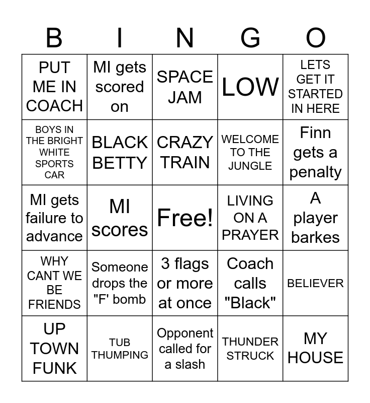 This bingo card has a free space and 61 words: TNT, TUB THUMPING, BAD BOYS, WHY CANT WE BE FRIENDS, THUNDER STRUCK, LOSE YOURSELF, BLACK BETTY, STRONGER, WELCOME TO THE JUNGLE, BACK AND BLACK, LOW, WE ARE THE CHAMPIONS, BOYS IN THE BRIGHT WHITE SPORTS CAR, EYE OF THE TIGER, HUMBLE, PUT ME IN COACH, MY HOUSE, LETS GET IT STARTED IN HERE, TURN DOWN FOR WHAT, CRAZY TRAIN, LIVING ON A PRAYER, SPACE JAM, UP TOWN FUNK, BELIEVER, D pole scores (either team), Either team goes 2 men down, Coach calls "White", Opponent gets failure to advance, Finn gets a penalty, Opponent gets a penalty, MI wins a faceoff, Ref says "My bad.", Coach calls "Yellow", More than half of MI goes to the bathroom at the half, MI gets scored on, Matteo falls, EZ leaves the box (must make people nervous), MI scores, Someone looses a shoe, MI gets failure to advance, MI gets a ground ball, Someone drops the "F' bomb, A player barkes, Someone gets yard saled, Coach calls "Black", Joey yells "Heavy!", MI gets a takeaway, Stick check, Any player breaks a stick, 3 flags or more at once, Opponent called for a slash, Opponent called for a trip, Opponent called for over and back, MI called for a slash, MI called for a trip, MI called for over and back, Booth plays "black and yellow", A moment where everyone asks WTF is going on, A timeout is called during a fast break, Opponent called for goalie interference and MI called for goalie interference.