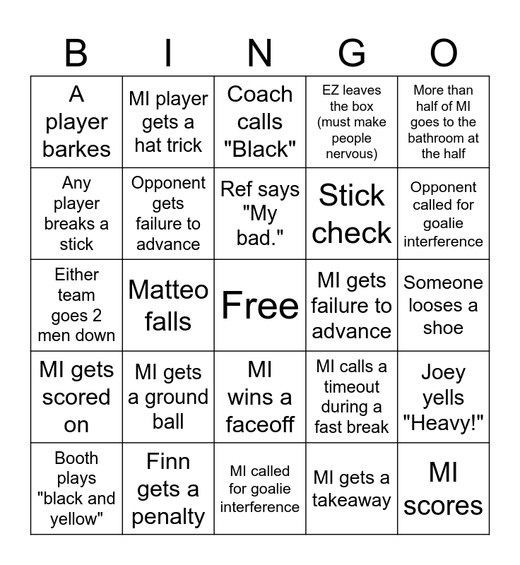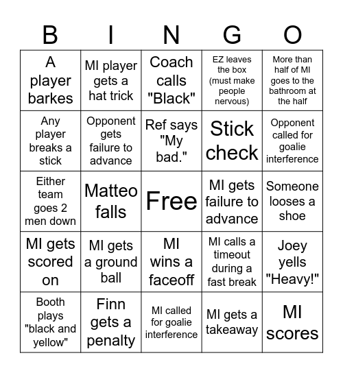 This bingo card has a free space and 40 words: D pole scores (either team), Either team goes 2 men down, Coach calls "White", Opponent gets failure to advance, Finn gets a penalty, MI wins a faceoff, Ref says "My bad.", Coach calls "Yellow", More than half of MI goes to the bathroom at the half, MI gets scored on, Matteo falls, EZ leaves the box (must make people nervous), MI scores, Someone looses a shoe, MI gets failure to advance, MI gets a ground ball, Someone drops the "F' bomb, A player barkes, Someone gets yard saled, Coach calls "Black", Joey yells "Heavy!", MI gets a takeaway, Stick check, Any player breaks a stick, 3 flags or more at once, Opponent called for a slash, Opponent called for a trip, Opponent called for over and back, MI called for a slash, MI called for a trip, MI called for over and back, Booth plays "black and yellow", A moment where everyone asks WTF is going on, MI calls a timeout during a fast break, Opponent called for goalie interference, MI called for goalie interference, Rocket goes up, Field Goal, MI player gets a hat trick and Amy goes on the field to yell at the refs..