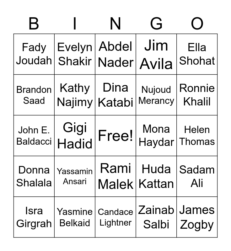 This bingo card has a free space and 24 words: Yassamin Ansari, Yasmine Belkaid, Dina Katabi, Isra Girgrah, Ella Shohat, Fady Joudah, Brandon Saad, Evelyn Shakir, Mona Haydar, Rami Malek, Nujoud Merancy, John E. Baldacci, Huda Kattan, Sadam Ali, Kathy Najimy, Zainab Salbi, Helen Thomas, Abdel Nader, Ronnie Khalil, Gigi Hadid, James Zogby, Donna Shalala, Jim Avila and Candace Lightner.