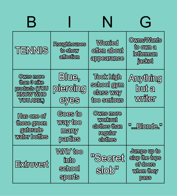 This bingo card has 16 words: WAY too into school sports, "...Blonde.", Worried often about appearance, TENNIS, Has one of those green gatorade water bottles, Roughhouses to show affection, Owns more workout clothes than regular clothes, "Secret slob", Owns more than 3 nike products (YOU KNOW WHO YOU ARE.), Blue, piercing eyes, Extrovert, Owns/Wants to own a letterman jacket, Goes to way too many parties, Anything but a writer, Took high school gym class way too serious and Jumps up to slap the tops of doors when they pass.