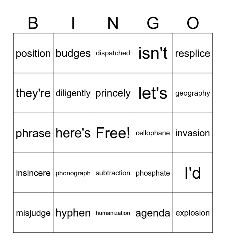 This bingo card has a free space and 34 words: prodigy, agenda, entice, centipede, insincere, diligently, resplice, misjudge, budges, indulges, princely, dispatched, thatch, stitches, cellophane, geography, hyphen, phrase, phonograph, phosphate, subtraction, education, position, invasion, humanization, explosion, isn't, they'll, let's, they're, won't, here's, I'd and you're.