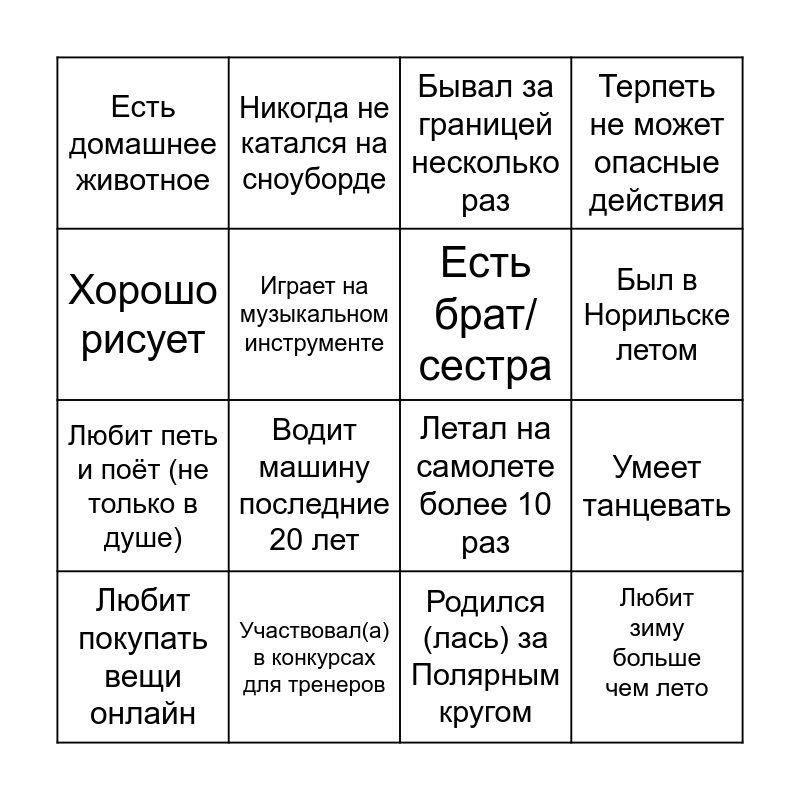 This bingo card has 16 words: Участвовал(а) в конкурсах для тренеров, Умеет танцевать, Бывал за границей несколько раз, Есть домашнее животное, Любит петь и поёт (не только в душе), Никогда не катался на сноуборде, Летал на самолете более 10 раз, Родился (лась) за Полярным кругом, Хорошо рисует, Играет на музыкальном инструменте, Любит покупать вещи онлайн, Терпеть не может опасные действия, Водит машину последние 20 лет, Был в Норильске летом, Есть брат/сестра and Любит зиму больше чем лето.