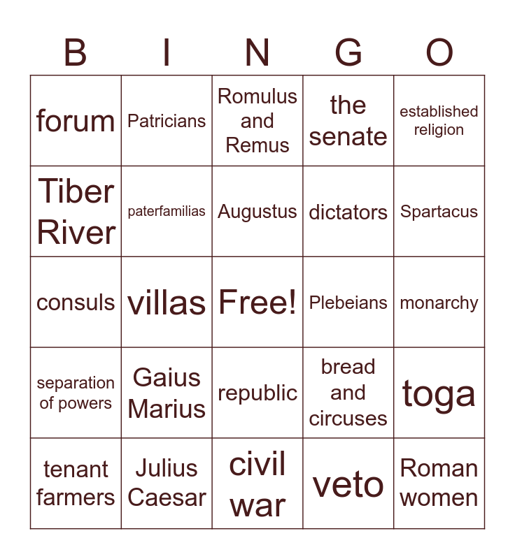This bingo card has a free space and 24 words: Gaius Marius, Julius Caesar, Augustus, tenant farmers, established religion, forum, Tiber River, Patricians, Plebeians, republic, dictators, consuls, bread and circuses, toga, paterfamilias, veto, monarchy, Romulus and Remus, Spartacus, villas, Roman women, separation of powers, the senate and civil war.