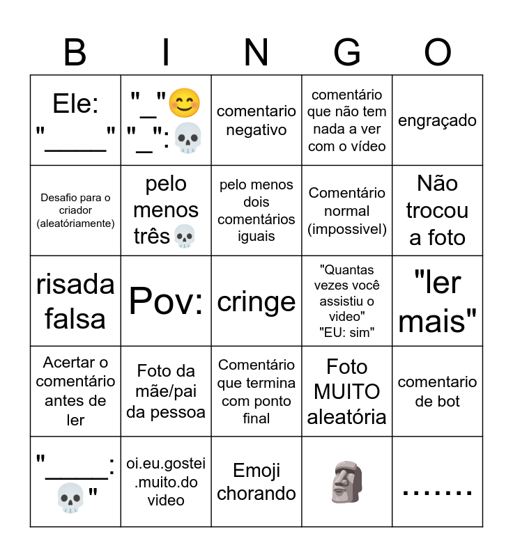 This bingo card has a free space and 32 words: 🗿, pelo menos três😂, Pov:, "___ :" "___ :", Acertar o comentário antes de ler, pelo menos três💀, engraçado, comentario de bot, "_"😊 "_":💀, Pelo menos 5 emojis, pelo menos dois comentários iguais, comentario negativo, "nome da musica?", Fala simplesmente oq literalmente passou no video, "Quantas vezes você assistiu o video" "EU: sim", mais de 3 linhas de comentário, "____:💀", risada falsa, Comentário que termina com ponto final, Foto da mãe/pai da pessoa, Foto MUITO aleatória, "____":❌ "____":✅, "ler mais", oi.eu.gostei .muito.do video, ......., comentário que não tem nada a ver com o vídeo, Comentário normal (impossivel), Desafio para o criador (aleatóriamente), Ele: "____", Emoji chorando, Erro gramatical and Não trocou a foto.