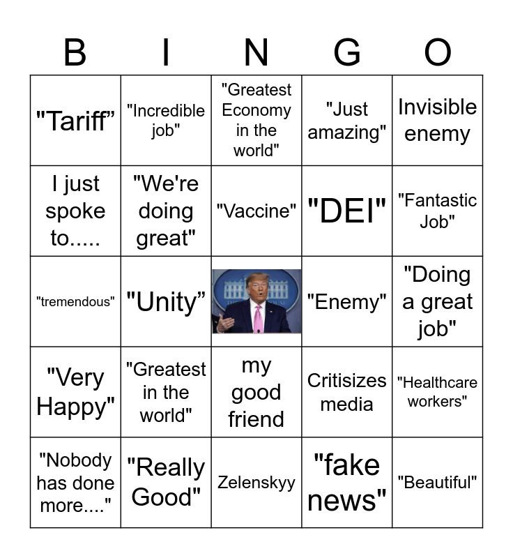This bingo card has a free space and 36 words: references War, "China", "Illegals", "DEI", "Beautiful", "Nobody has done more....", "Greatest in the world", "Trudeau", "Just amazing", "He's(they're, she's,etc) great ", "Very Happy", "Unity”, "My Administration", "Doing a great job", "tremendous", "Incredible job", Zelenskyy, "Enemy", "Fantastic Job", "Tariff”, "Really Good", "Vaccine", Critisizes media, "DOGE/Elon”, "I spoke with ALL of the ......", "We're doing great", "Greatest Economy in the world", "Unity", Invisible enemy, I just spoke to....., Positive stories, my good friend, "fake news", "Healthcare workers", Thanks healthcare workers and advises using/promotes a medicine or treatment.
