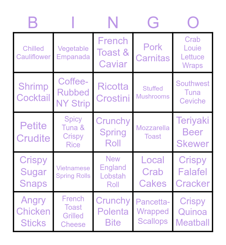 This bingo card has a free space and 24 words: Vietnamese Spring Rolls, French Toast Grilled Cheese, Ricotta Crostini, Angry Chicken Sticks, Crab Louie Lettuce Wraps, Chilled Cauliflower, Shrimp Cocktail, Vegetable Empanada, Mozzarella Toast, New England Lobstah Roll, Stuffed Mushrooms, Petite Crudite, Local Crab Cakes, Crispy Falafel Cracker, Coffee-Rubbed NY Strip, Pancetta-Wrapped Scallops, Teriyaki Beer Skewer, French Toast & Caviar, Southwest Tuna Ceviche, Spicy Tuna & Crispy Rice, Crispy Quinoa Meatball, Crispy Sugar Snaps, Pork Carnitas and Crunchy Polenta Bite.