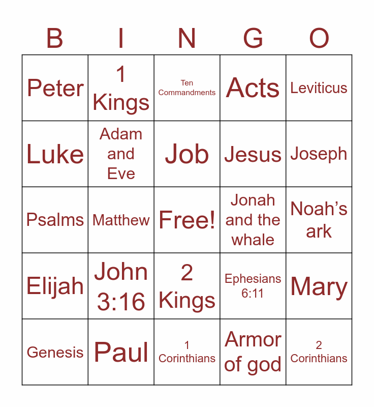 This bingo card has a free space and 24 words: Genesis, John 3:16, Job, Armor of god, Leviticus, Peter, 1 Kings, Ten Commandments, Jonah and the whale, Noah’s ark, Psalms, Adam and Eve, Ephesians 6:11, Mary, Luke, Paul, 1 Corinthians, Acts, Joseph, Elijah, Matthew, 2 Kings, Jesus and 2 Corinthians.