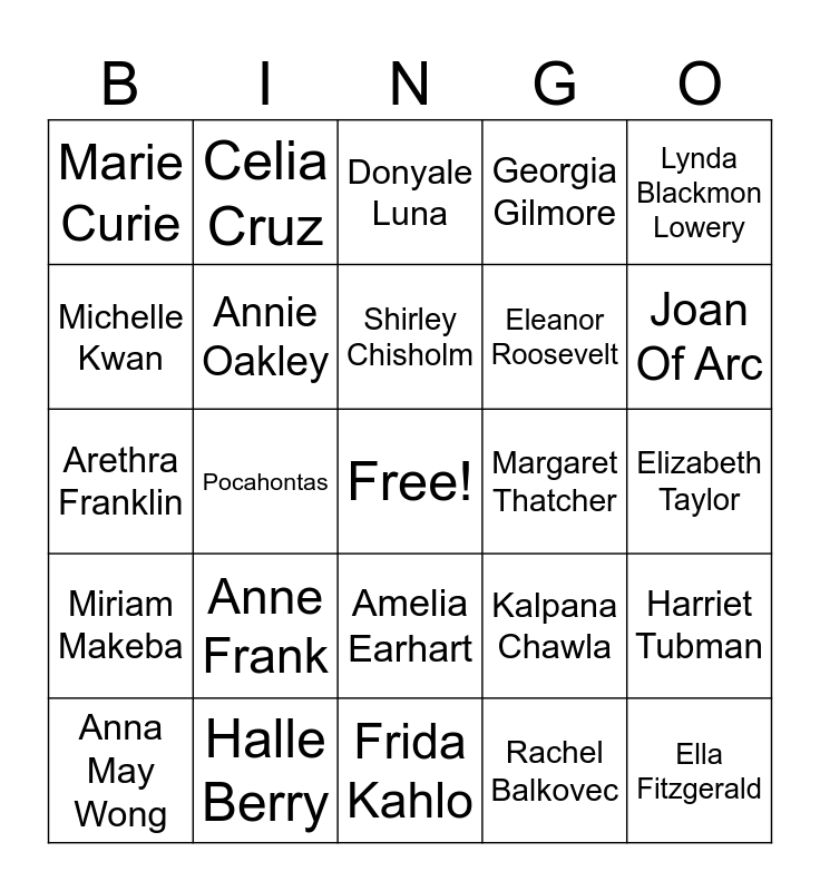 This bingo card has a free space and 24 words: Anne Frank, Halle Berry, Shirley Chisholm, Anna May Wong, Lynda Blackmon Lowery, Marie Curie, Michelle Kwan, Celia Cruz, Margaret Thatcher, Amelia Earhart, Eleanor Roosevelt, Arethra Franklin, Kalpana Chawla, Harriet Tubman, Annie Oakley, Rachel Balkovec, Elizabeth Taylor, Donyale Luna, Joan Of Arc, Pocahontas, Ella Fitzgerald, Miriam Makeba, Georgia Gilmore and Frida Kahlo.