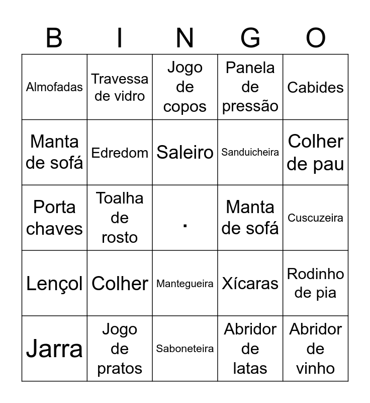 This bingo card has a free space and 39 words: Faca, Tábua de corte, Travesseiros, Edredom, Jarra, Mantegueira, Saleiro, Lixeira, Cabides, Lençol, Toalha de rosto, Panela de pressão, Abridor de vinho, Cuscuzeira, Manta de sofá, Colher, Forma de bolo, Almofadas, Guardanapos, Xícaras, Manta de sofá, Saboneteira, Sanduicheira, Colher de pau, Garfo, Toalha de banho, Frigideira, Tapete de banheiro, Boleira, Travessa de vidro, Jogo de pratos, Porta temperos, Jogo de copos, Jogo de pratos, Abridor de latas, Cabides, Rodinho de pia, Porta chaves and Cesto de roupas.
