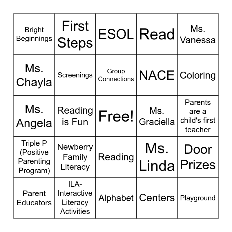 This bingo card has a free space and 24 words: Newberry Family Literacy, ILA-Interactive Literacy Activities, Group Connections, Parent Educators, Ms. Vanessa, Bright Beginnings, Ms. Chayla, First Steps, Ms. Graciella, Reading, NACE, Ms. Angela, Ms. Linda, Door Prizes, Screenings, Centers, Parents are a child's first teacher, ESOL, Coloring, Reading is Fun, Playground, Triple P (Positive Parenting Program), Read and Alphabet.