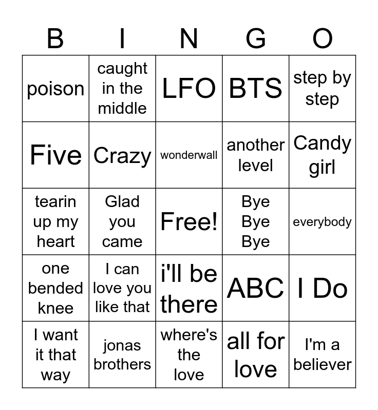 This bingo card has a free space and 29 words: I want it that way, sucker, Glad you came, she looks so perfect, poison, LFO, Crazy, I can love you like that, Bye Bye Bye, jonas brothers, everybody, I'm a believer, where's the love, all for love, Candy girl, Drag me down, i'll be there, one bended knee, step by step, tearin up my heart, ABC, Big time rush, another level, Five, BTS, caught in the middle, I Do, wonderwall and swear it again.