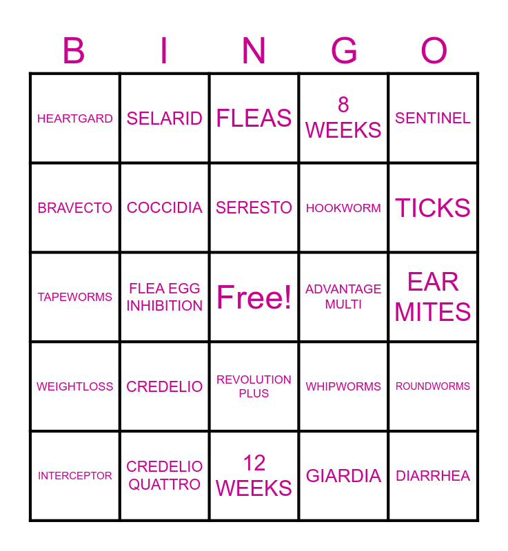 This bingo card has a free space and 24 words: CREDELIO, CREDELIO QUATTRO, SERESTO, INTERCEPTOR, SENTINEL, HEARTGARD, BRAVECTO, SELARID, ADVANTAGE MULTI, REVOLUTION PLUS, HOOKWORM, TAPEWORMS, WHIPWORMS, ROUNDWORMS, COCCIDIA, GIARDIA, EAR MITES, FLEAS, TICKS, FLEA EGG INHIBITION, DIARRHEA, WEIGHTLOSS, 8 WEEKS and 12 WEEKS.