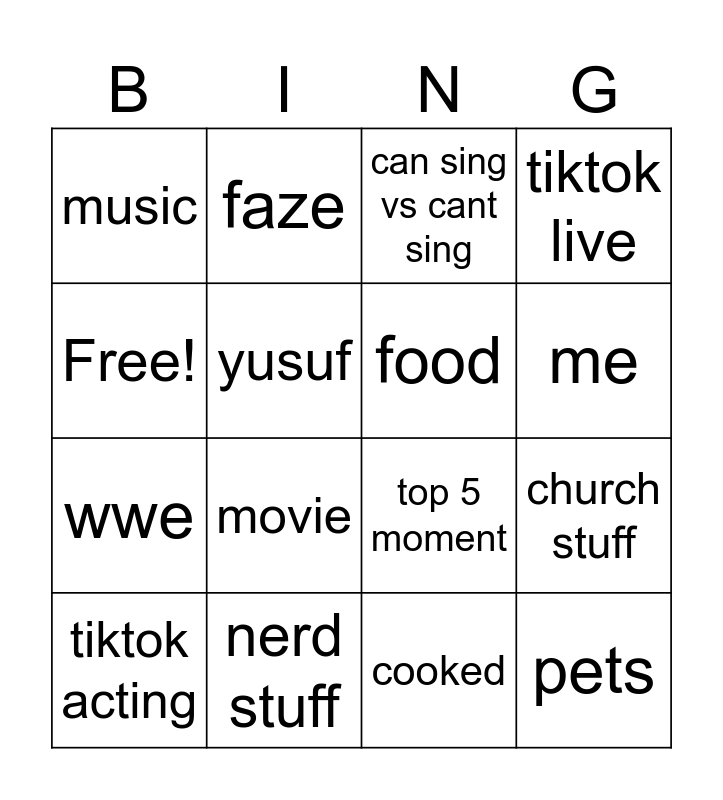 This bingo card has 16 words: nerd stuff, church stuff, can sing vs cant sing, music, wwe, faze, top 5 moment, cooked, Free!, yusuf, tiktok acting, tiktok live, movie, me, food and pets.