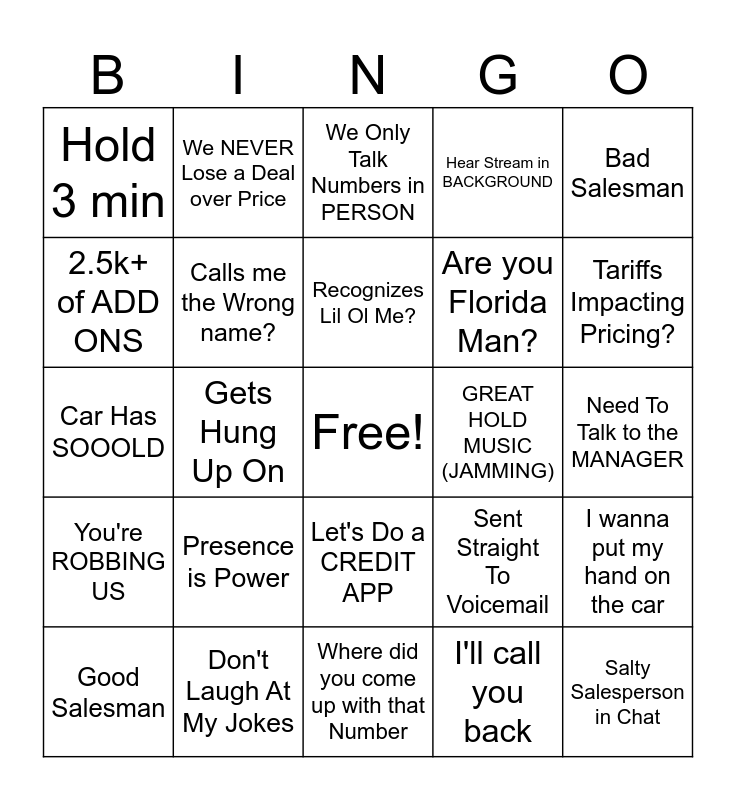 This bingo card has a free space and 24 words: Presence is Power, Don't Laugh At My Jokes, Recognizes Lil Ol Me?, Good Salesman, Bad Salesman, Hold 3 min, 2.5k+ of ADD ONS, We NEVER Lose a Deal over Price, GREAT HOLD MUSIC (JAMMING), Let's Do a CREDIT APP, Are you Florida Man?, Car Has SOOOLD, Sent Straight To Voicemail, I wanna put my hand on the car, Calls me the Wrong name?, I'll call you back, Need To Talk to the MANAGER, We Only Talk Numbers in PERSON, Tariffs Impacting Pricing?, Gets Hung Up On, Salty Salesperson in Chat, You're ROBBING US, Hear Stream in BACKGROUND and Where did you come up with that Number.