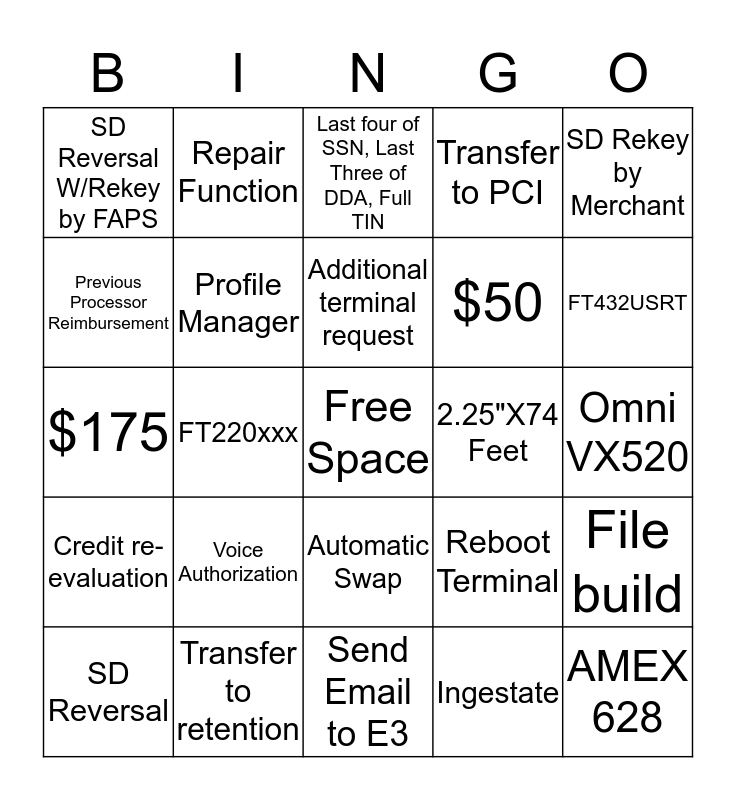 This bingo card has a free space and 24 words: Voice Authorization, Transfer to retention, Additional terminal request, SD Reversal, SD Rekey by Merchant, SD Reversal W/Rekey by FAPS, Previous Processor Reimbursement, Repair Function, 2.25"X74 Feet, Automatic Swap, $50, $175, Reboot Terminal, File build, Profile Manager, Ingestate, Omni VX520, Last four of SSN, Last Three of DDA, Full TIN, FT432USRT, FT220xxx, AMEX 628, Credit re-evaluation, Transfer to PCI and Send Email to E3.