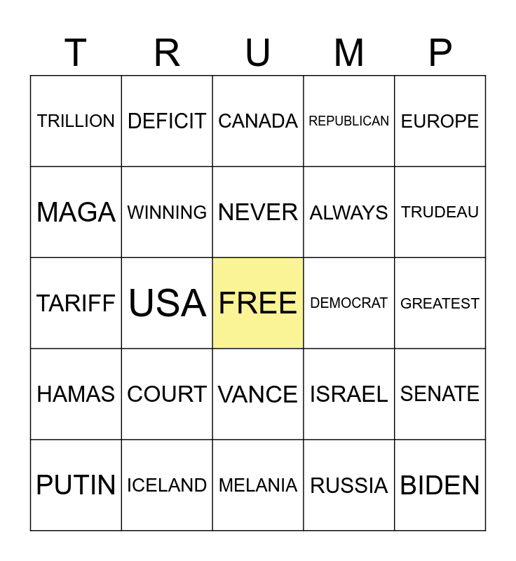 This bingo card has a free space and 45 words: CHINA, BIDEN, HUUUGE, PUTIN, ZELENSKYY, RUSSIA, CANADA, MEXICO, EUROPE, ICELAND, REPUBLICAN, DEMOCRAT, VANCE, COURT, PROMISE, MELANIA, BORDER, TARIFF, BARRON, TRUDEAU, DEFICIT, MUSK, DOGE, TRILLION, BILLION, GREATEST, BEST, PEACE, ISRAEL, HAMAS, D.C., SENATE, HOUSE, BILL, EXECUTIVE ORDER, USA, STRONG, MILITARY, FLAG, NEVER, MAGA, ALWAYS, LARGEST, WINNING and DEAL.
