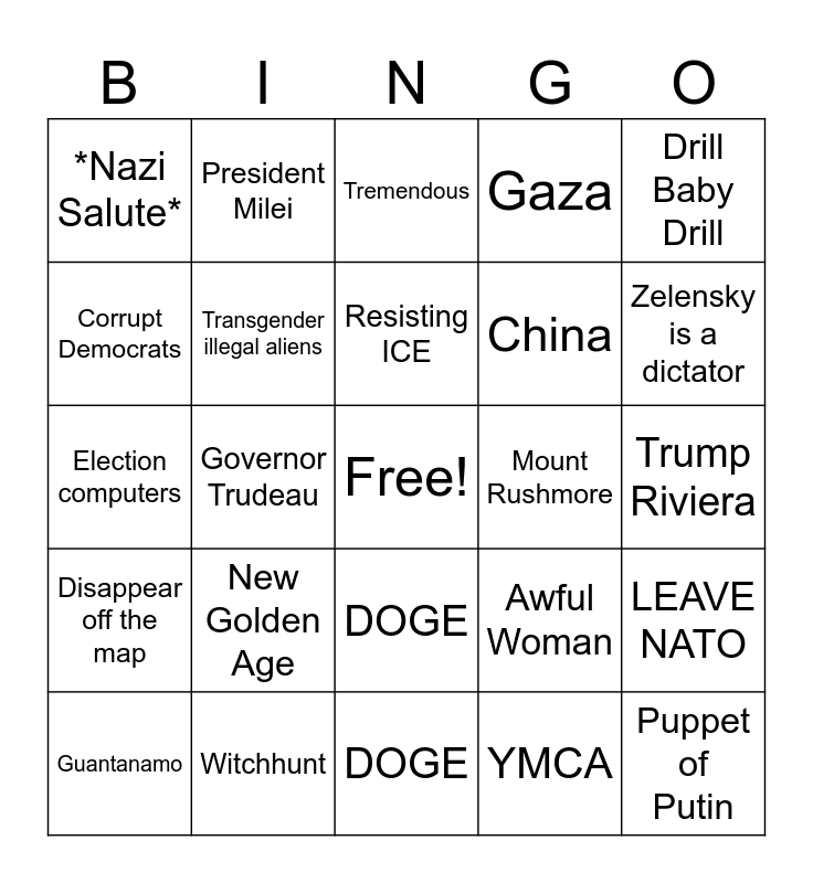 This bingo card has a free space and 34 words: Third Term, YMCA, Gavin Newscum, Department of Education, Disappear off the map, Transgender illegal aliens, Drill Baby Drill, Guantanamo, President Milei, We are looking at Medicare, Resisting ICE, Tremendous, Federal Abortion Ban, Biden Inflation, Mount Rushmore, Zelensky is a dictator, Witchhunt, Election computers, New Golden Age, Awful Woman, DOGE, Putin is a smart guy, *Nazi Salute*, Trump Riviera, DOGE, Puppet of Putin, Gaza, Tariffs, China, Corrupt Democrats, Beautiful Wall, Governor Trudeau, LEAVE NATO and Men in Women's Sports.