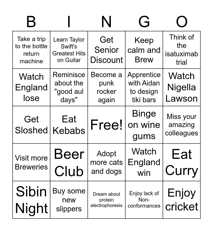 This bingo card has a free space and 24 words: Sibin Night, Beer Club, Become a punk rocker again, Enjoy lack of Non-conformances, Think of the isatuximab trial, Take a trip to the bottle return machine, Learn Taylor Swift's Greatest Hits on Guitar, Get Senior Discount, Binge on wine gums, Miss your amazing colleagues, Get Sloshed, Reminisce about the "good aul days", Watch England win, Eat Curry, Watch England lose, Buy some new slippers, Dream about protein electrophoresis, Keep calm and Brew, Watch Nigella Lawson, Visit more Breweries, Eat Kebabs, Adopt more cats and dogs, Apprentice with Aidan to design tiki bars and Enjoy cricket.