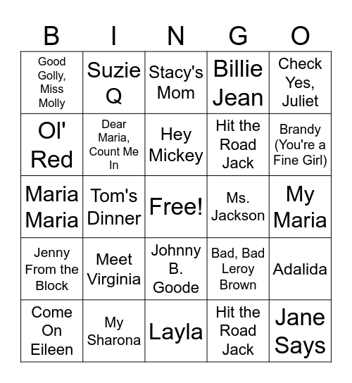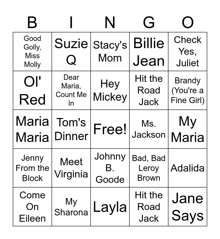 This bingo card has a free space and 57 words: Jolene, Come On Eileen, Hey Jude, Good Golly, Miss Molly, Layla, Eleanor Rigby, Dear Maria, Count Me In, Proud Mary, Hit the Road Jack, Jack and Diane, Billie Jean, Bennie and the Jets, Roxanne, Sweet Caroline, Peggy Sue, Boy Name Sue, Check Yes, Juliet, Tom's Dinner, Jessie's Girl, Jane Says, Ms. Jackson, Louie Louie, Bad, Bad Leroy Brown, Stacy's Mom, 867-5309/Jenny, Hey Mickey, Buddy Holly, Mrs. Robinson, Brandy (You're a Fine Girl), Barbara Ann, Goodbye Earl, Rocky Raccoon, Proud Mary, Fancy, My Maria, Ol' Red, Alejandro, Maria Maria, Hey There Delilah, Jenny From the Block, Suzie Q, Johnny B. Goode, Bette Davis Eyes, Barbie Girl, Help Me, Rhonda, Cecilia, Meet Virginia, My Sharona, Mustang Sally, Wake Up Little Susie, Cotton Eye Joe, Hit the Road Jack, Mr. Jones, Breakfast At Tiffany's, Mr. Brightside, Adalida and Big Bad John.