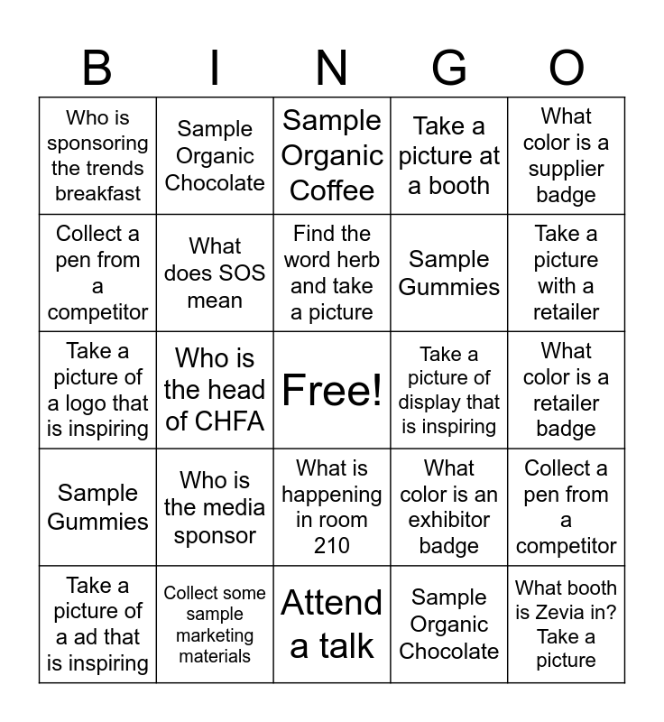 This bingo card has a free space and 28 words: Collect a pen from a competitor, Sample Organic Coffee, Sample Gummies, Sample Organic Chocolate, Collect a pen from a competitor, Sample Organic Coffee, Sample Organic Chocolate, Sample Gummies, Take a picture of display that is inspiring, Take a picture of a ad that is inspiring, Take a picture of a logo that is inspiring, Take a picture at a booth, Collect some sample marketing materials, Attend a talk, Take a picture with a retailer, Find out who is in booth 421, Who is the media sponsor, What does SOS mean, Find the word herb and take a picture, What is happening in room 210, Who is sponsoring the trends breakfast, Where are the industry achievements awards being held, What booth is Zevia in? Take a picture, Who is the head of CHFA, What color is a retailer badge, What color is an exhibitor badge, What color is a supplier badge and How many retailers attend the show.