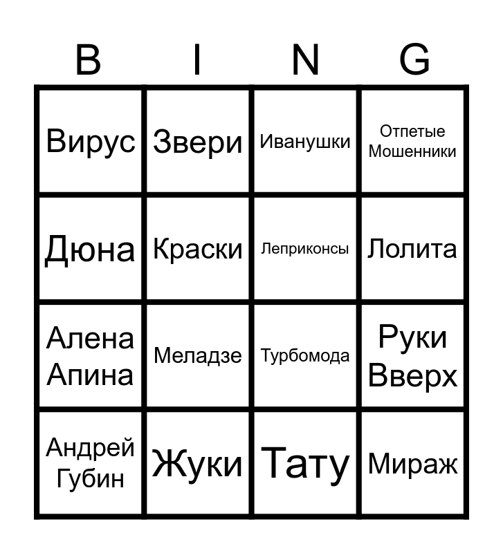 This bingo card has 16 words: Жуки, Руки Вверх, Иванушки, Вирус, Алена Апина, Звери, Турбомода, Тату, Дюна, Краски, Андрей Губин, Отпетые Мошенники, Меладзе, Лолита, Леприконсы and Мираж.