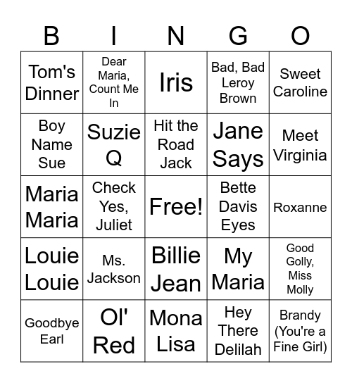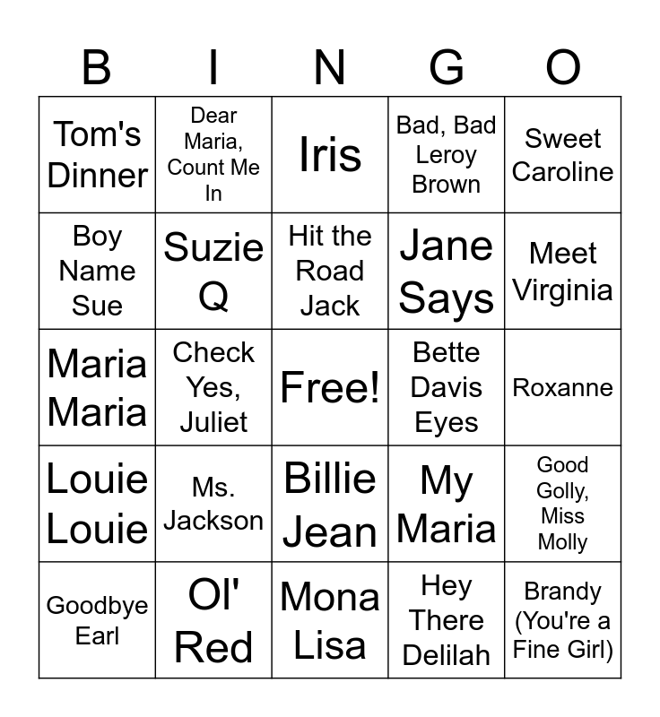 This bingo card has a free space and 66 words: Jolene, Come On Eileen, Hey Jude, Good Golly, Miss Molly, Layla, Eleanor Rigby, Dear Maria, Count Me In, Proud Mary, Hit the Road Jack, Jack and Diane, Billie Jean, Bennie and the Jets, Roxanne, Sweet Caroline, Peggy Sue, Boy Name Sue, Check Yes, Juliet, Tom's Dinner, Jessie's Girl, Jane Says, Ms. Jackson, Louie Louie, Bad, Bad Leroy Brown, Stacy's Mom, 867-5309/Jenny, Hey Mickey, Buddy Holly, Mrs. Robinson, Brandy (You're a Fine Girl), Barbara Ann, Goodbye Earl, Rocky Raccoon, Proud Mary, Fancy, My Maria, Ol' Red, Alejandro, Maria Maria, Hey There Delilah, Jenny From the Block, Suzie Q, Johnny B. Goode, Bette Davis Eyes, Barbie Girl, Help Me, Rhonda, Cecilia, Meet Virginia, My Sharona, Mustang Sally, Wake Up Little Susie, Cotton Eye Joe, Hit the Road Jack, Mr. Jones, Breakfast At Tiffany's, Mr. Brightside, Adalida, Big Bad John, Clint Eastwood, Iris, Mona Lisa, Hello Mary Lou, Mack the Knife, Mr. Sandman, Hello Dolly!, Sherry and Samson.
