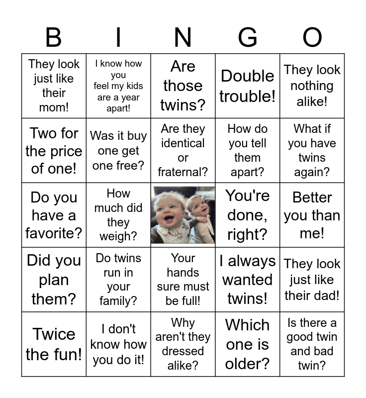 This bingo card has a free space and 24 words: Twice the fun!, Do twins run in your family?, Are they identical or fraternal?, Which one is older?, They look nothing alike!, They look just like their mom!, I know how you feel my kids are a year apart!, Are those twins?, You're done, right?, Better you than me!, Do you have a favorite?, Was it buy one get one free?, I always wanted twins!, They look just like their dad!, Two for the price of one!, I don't know how you do it!, Why aren't they dressed alike?, Double trouble!, What if you have twins again?, Did you plan them?, How much did they weigh?, Your hands sure must be full!, How do you tell them apart? and Is there a good twin and bad twin?.