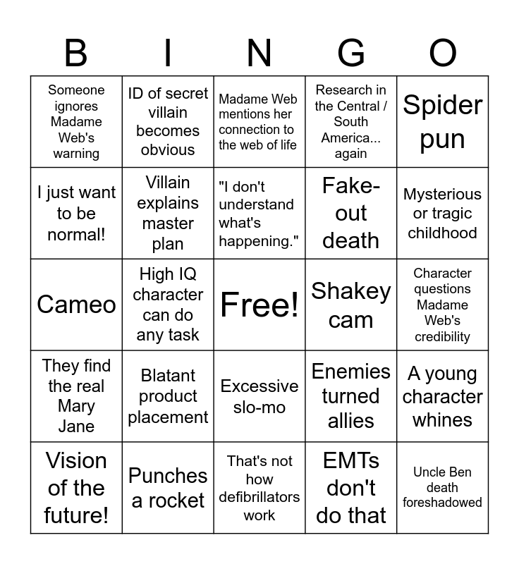 This bingo card has a free space and 24 words: Blatant product placement, Punches a rocket, "I don't understand what's happening.", Vision of the future!, Spider pun, Someone ignores Madame Web's warning, I just want to be normal!, ID of secret villain becomes obvious, Shakey cam, Excessive slo-mo, Fake-out death, Cameo, Enemies turned allies, A young character whines, Villain explains master plan, EMTs don't do that, Character questions Madame Web's credibility, Madame Web mentions her connection to the web of life, Mysterious or tragic childhood, High IQ character can do any task, Uncle Ben death foreshadowed, They find the real Mary Jane, Research in the Central / South America... again and That's not how defibrillators work.
