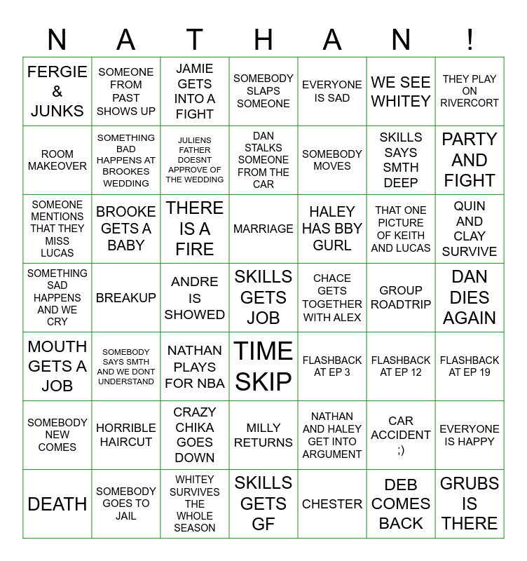 This bingo card has 49 words: CAR ACCIDENT ;), SKILLS SAYS SMTH DEEP, CHESTER, BREAKUP, THERE IS A FIRE, DAN DIES AGAIN, SOMEONE FROM PAST SHOWS UP, WHITEY SURVIVES THE WHOLE SEASON, WE SEE WHITEY, TIME SKIP, THEY PLAY ON RIVERCORT, SOMEBODY SLAPS SOMEONE, THAT ONE PICTURE OF KEITH AND LUCAS, HALEY HAS BBY GURL, HORRIBLE HAIRCUT, GROUP ROADTRIP, ROOM MAKEOVER, PARTY AND FIGHT, EVERYONE IS HAPPY, EVERYONE IS SAD, SOMEBODY MOVES, ANDRE IS SHOWED, FERGIE & JUNKS, SOMETHING BAD HAPPENS AT BROOKES WEDDING, DEATH, JULIENS FATHER DOESNT APPROVE OF THE WEDDING, QUIN AND CLAY SURVIVE, SOMEBODY GOES TO JAIL, MARRIAGE, BROOKE GETS A BABY, GRUBS IS THERE, CHACE GETS TOGETHER WITH ALEX, SOMEBODY NEW COMES, CRAZY CHIKA GOES DOWN, SOMETHING SAD HAPPENS AND WE CRY, FLASHBACK AT EP 3, FLASHBACK AT EP 12, FLASHBACK AT EP 19, SOMEONE MENTIONS THAT THEY MISS LUCAS, NATHAN PLAYS FOR NBA, MILLY RETURNS, MOUTH GETS A JOB, SKILLS GETS JOB, SKILLS GETS GF, DAN STALKS SOMEONE FROM THE CAR, JAMIE GETS INTO A FIGHT, NATHAN AND HALEY GET INTO ARGUMENT, SOMEBODY SAYS SMTH AND WE DONT UNDERSTAND and DEB COMES BACK.
