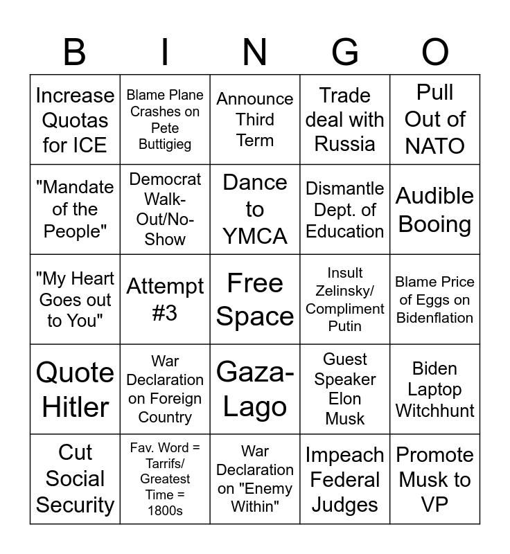 This bingo card has a free space and 24 words: War Declaration on Foreign Country, Fav. Word = Tarrifs/ Greatest Time = 1800s, Dance to YMCA, Cut Social Security, Pull Out of NATO, Increase Quotas for ICE, "Mandate of the People", Blame Plane Crashes on Pete Buttigieg, Insult Zelinsky/ Compliment Putin, Gaza-Lago, Dismantle Dept. of Education, "My Heart Goes out to You", Guest Speaker Elon Musk, Biden Laptop Witchhunt, Democrat Walk-Out/No-Show, Impeach Federal Judges, Blame Price of Eggs on Bidenflation, Announce Third Term, Audible Booing, Attempt #3, Promote Musk to VP, Quote Hitler, Trade deal with Russia and War Declaration on "Enemy Within".