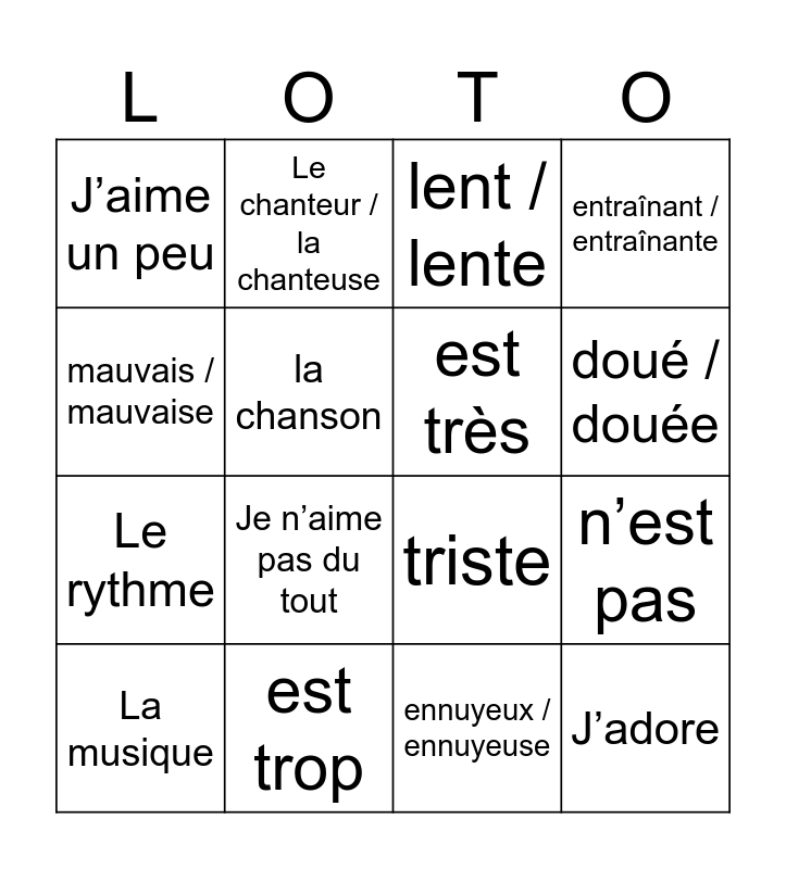 This bingo card has 23 words: J’adore, bof, doué / douée, J’aime beaucoup, mauvais / mauvaise, J’aime un peu, la chanson, Le chanteur / la chanteuse, La musique, Je n’aime pas trop, Je n’aime pas du tout, Le rythme, Le clip, heureux / heureuse, est trop, est assez, lent / lente, triste, est très, n’est pas, entraînant / entraînante, ennuyeux / ennuyeuse and bon / bonne.