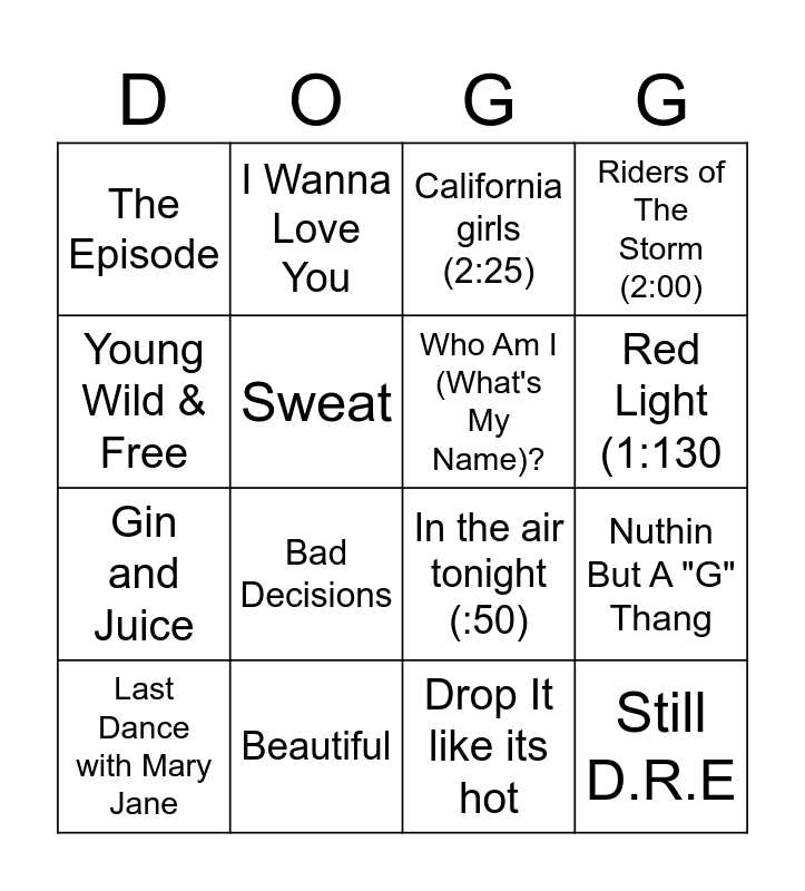 This bingo card has 19 words: In the air tonight (:50), Red Light, California girls (2:25), Still D.R.E, Nuthin But A "G" Thang, Young Wild & Free, Drop It like its hot, The Episode, I Wanna Love You, Gin and Juice, Bad Decisions, Sweat, Who Am I (What's My Name)?, Beautiful, Last Dance with Mary Jane, P.I.M.P ( 1:25), Riders of The Storm (2:00), Red Light (1:130 and My Medicine.