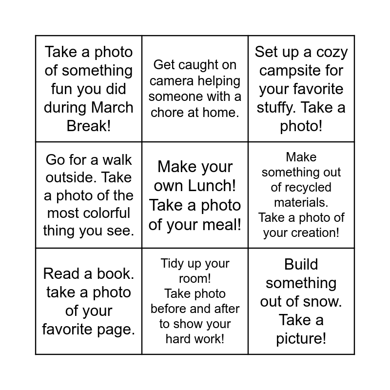 This bingo card has 9 words: Read a book. take a photo of your favorite page., Set up a cozy campsite for your favorite stuffy. Take a photo!, Get caught on camera helping someone with a chore at home., Go for a walk outside. Take a photo of the most colorful thing you see., Take a photo of something fun you did during March Break!, Make something out of recycled materials. Take a photo of your creation!, Make your own Lunch! Take a photo of your meal!, Build something out of snow. Take a picture! and Tidy up your room! Take photo before and after to show your hard work!.