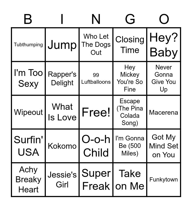 This bingo card has 1 images, a free space and 75 words: Stacy’s Mom, Who Let The Dogs Out, Mambo No. 5, Come On Eileen, 867-5309, I Want Candy, Relax, It Takes Two, We're Not Gonna Take It, Don't Worry Be Happy, Play That Funky Music, 99 Luftballoons, I'm Too Sexy, Whip It, What Is Love, The Safety Dance, Funkytown, Rockin' Robin, Hey? Baby, Monster Mash, Wipeout, Rapper's Delight, Jump, Closing Time, Somebody That I Used To Know, Whoomp? (There It Is), Barbie Girl, Ice Ice Baby, Blue (Da Ba Dee), The Lion Sleeps Tonight, Rico Suave, Steal My Sunshine, I'm Gonna Be (500 Miles), Never Gonna Give You Up, Hey Mickey You're So Fine, La Bamba, Friday, Macerena, Take on Me, My Sharona, No Rain, Copperhead Road, Tainted Love, Sugar, Sugar, Spirit in the Sky, Achy Breaky Heart, Tubthumping, MMM Bop, The Boys Are Back in Town, Do You Love Me, O-o-h Child, Mr. Big Stuff, Party All the Time, Supersonic, Easy Lover, You Sexy Thing, Walking On Sunshine, You Make My Dreams (Come True), Wake Me Up Before You Go-Go, Kokomo, The Power of Love, In the Summertime, Hit Me With Your Best Shot, I Think We're Alone Now, Centerfold, Escape (The Pina Colada Song), Hooked On A Feeling, We Built This City, Stayin' Alive, Got My Mind Set on You, Surfin' USA, Jessie's Girl, Abracadabra, Super Freak and Celebration.