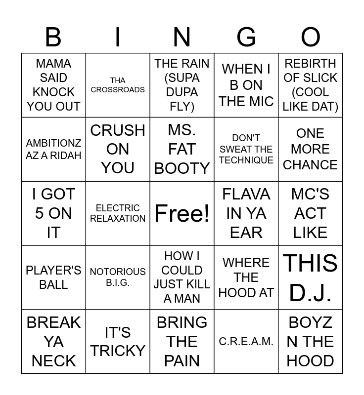 This bingo card has a free space and 32 words: C.R.E.A.M., THE MESSAGE, ELECTRIC RELAXATION, KEEP YA HEAD UP, PLAYER'S BALL, CRUSH ON YOU, REBIRTH OF SLICK (COOL LIKE DAT), THIS D.J., THA CROSSROADS, DA ART OF STORYTELLIN, MS. FAT BOOTY, THE RAIN (SUPA DUPA FLY), GET MONEY, IF I RULED THE WORLD, FLAVA IN YA EAR, RAPPER'S DELIGHT, BREAK YA NECK, I GOT 5 ON IT, HOW I COULD JUST KILL A MAN, NOTORIOUS B.I.G., WHERE THE HOOD AT, REGULATE, MC'S ACT LIKE, IT'S TRICKY, BOYZ N THE HOOD, WHEN I B ON THE MIC, DON'T SWEAT THE TECHNIQUE, AMBITIONZ AZ A RIDAH, MAMA SAID KNOCK YOU OUT, BRING THE PAIN, PASSIN ME BY and ONE MORE CHANCE.