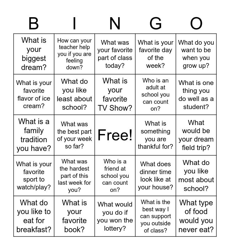 This bingo card has a free space and 24 words: What was the hardest part of this last week for you?, What is your favorite book?, What is your favorite TV Show?, What do you like to eat for breakfast?, What do you want to be when you grow up?, What is your biggest dream?, What is your favorite flavor of ice cream?, How can your teacher help you if you are feeling down?, What is something you are thankful for?, Who is a friend at school you can count on?, Who is an adult at school you can count on?, What is a family tradition you have?, What does dinner time look like at your house?, What do you like most about school?, What do you like least about school?, What is the best way I can support you outside of class?, What would be your dream field trip?, What was your favorite part of class today?, What is one thing you do well as a student?, What was the best part of your week so far?, What type of food would you never eat?, What is your favorite sport to watch/play?, What is your favorite day of the week? and What would you do if you won the lottery?.