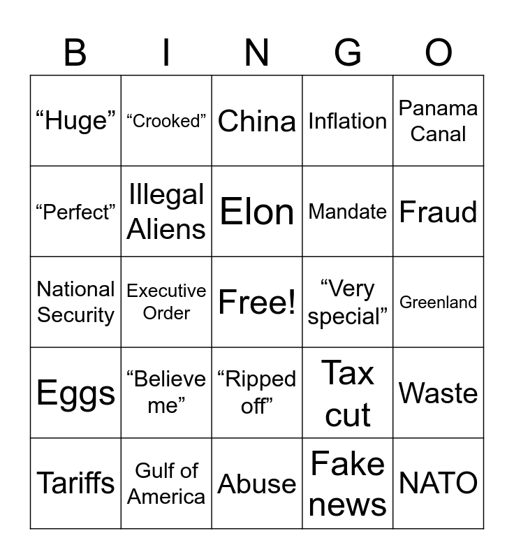 This bingo card has a free space and 24 words: “Believe me”, Gulf of America, Elon, Tariffs, Panama Canal, “Huge”, “Perfect”, “Crooked”, “Very special”, “Ripped off”, Mandate, National Security, Tax cut, Waste, Illegal Aliens, Fake news, Greenland, China, Fraud, Executive Order, NATO, Eggs, Inflation and Abuse.