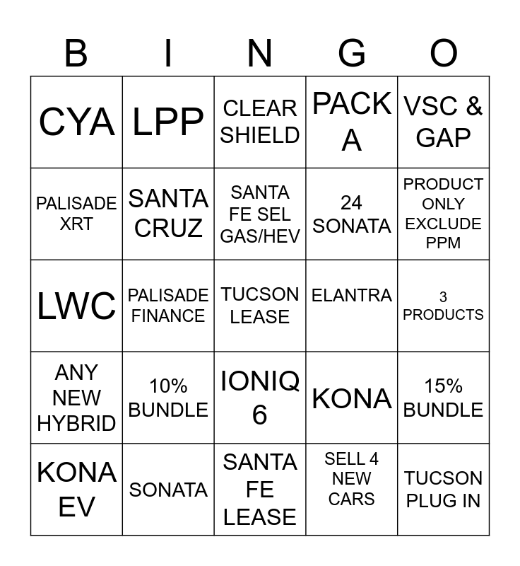 This bingo card has a free space and 24 words: 10% BUNDLE, SONATA, SANTA FE SEL GAS/HEV, KONA EV, VSC & GAP, CYA, PALISADE XRT, LPP, ELANTRA, IONIQ 6, 24 SONATA, LWC, KONA, 15% BUNDLE, SANTA CRUZ, SELL 4 NEW CARS, 3 PRODUCTS, CLEAR SHIELD, PRODUCT ONLY EXCLUDE PPM, PALISADE FINANCE, TUCSON PLUG IN, ANY NEW HYBRID, PACK A and SANTA FE LEASE.
