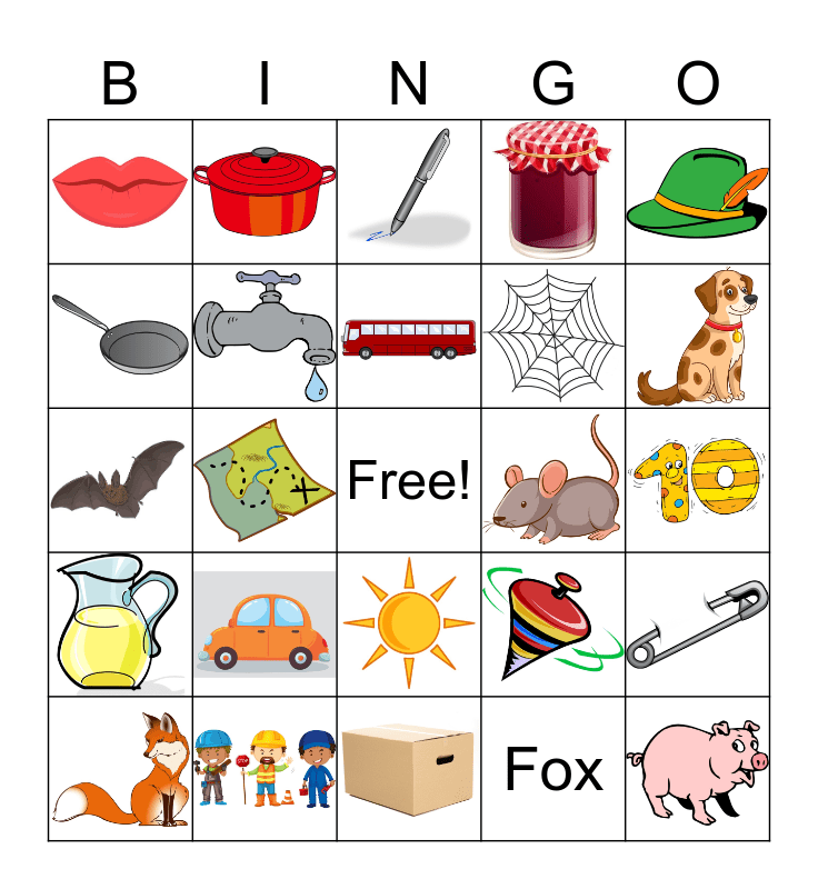 This bingo card has 24 images, a free space and 1 words: Fox.