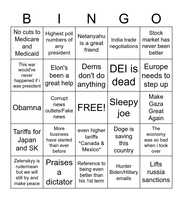 This bingo card has a free space and 24 words: More business have started than ever before, Praises a dictator, Dems don't do anything, Zelenskyy is rude/mean but we will still try and make peace, Stock market has never been better, No cuts to Medicare and Medicaid, This war would've never happened if i was president, Highest poll numbers of any president, Sleepy joe, even higher tariffs *Canada & Mexico*, DEI is dead, Obamna, Doge is saving this country, The economy was so bad when i took over, Elon's been a great help, Hunter Biden/Hillary emails, Make Gaza Great Again, Netanyahu is a great friend, Europe needs to step up, Corrupt news outlets/Fake news, Lifts russia sanctions, Tariffs for Japan and SK, India trade negotiations and Reference to being even better than his 1st term.