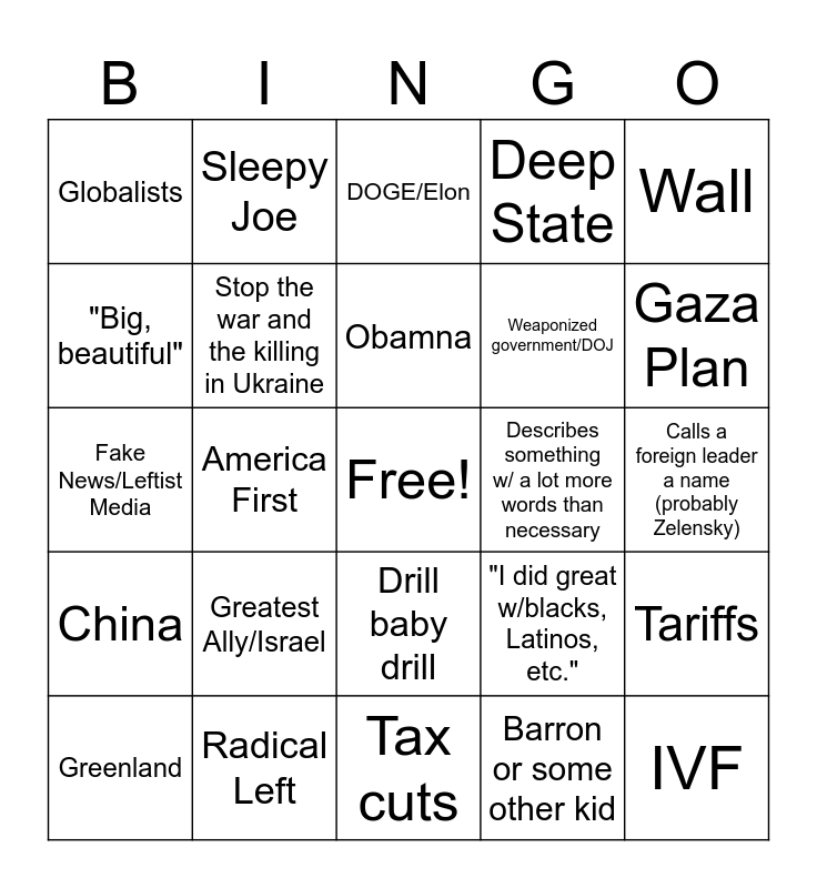 This bingo card has a free space and 24 words: Greatest Ally/Israel, Radical Left, Obamna, Greenland, Wall, Globalists, "Big, beautiful", Sleepy Joe, Describes something w/ a lot more words than necessary, Drill baby drill, Weaponized government/DOJ, Fake News/Leftist Media, "I did great w/blacks, Latinos, etc.", Tariffs, Stop the war and the killing in Ukraine, Barron or some other kid, Calls a foreign leader a name (probably Zelensky), DOGE/Elon, Gaza Plan, America First, IVF, China, Deep State and Tax cuts.