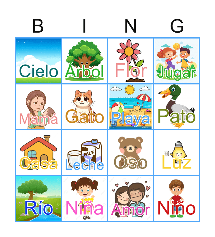 This bingo card has 28 images and 28 words: Sol, Luna, Casa, Perro, Gato, Flor, Árbol, Niño, Niña, Mar, Oso, Jugar, Colina, Silla, Leche, Libro, Ratón, Playa, Pato, Mano, Cielo, Nube, Río, Luz, Amor, Papá, Mamá and Pelota.