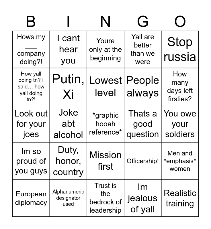 This bingo card has 25 words: Duty, honor, country, Trust is the bedrock of leadership, Lowest level, European diplomacy, Stop russia, Hows my ___ company doing?!, How yall doing tn? I said… how yall doing tn?!, I cant hear you, Thats a good question, Mission first, People always, Look out for your joes, Officership!, Men and *emphasis* women, Putin, Xi, Realistic training, You owe your soldiers, Youre only at the beginning, How many days left firsties?, Joke abt alcohol, *graphic hooah reference*, Alphanumeric designator used, Im so proud of you guys, Yall are better than we were and Im jealous of yall.
