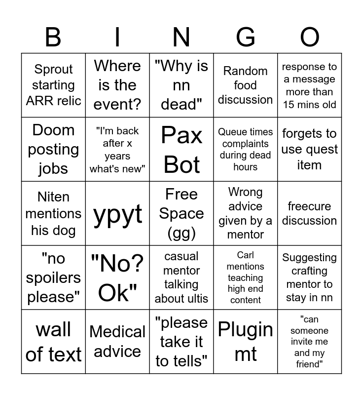 This bingo card has a free space and 24 words: "No? Ok", Medical advice, Pax Bot, wall of text, response to a message more than 15 mins old, Sprout starting ARR relic, Doom posting jobs, Where is the event?, Wrong advice given by a mentor, casual mentor talking about ultis, Queue times complaints during dead hours, Niten mentions his dog, Carl mentions teaching high end content, Suggesting crafting mentor to stay in nn, "I'm back after x years what's new", Plugin mt, freecure discussion, "Why is nn dead", forgets to use quest item, ypyt, "can someone invite me and my friend", "no spoilers please", Random food discussion and "please take it to tells".