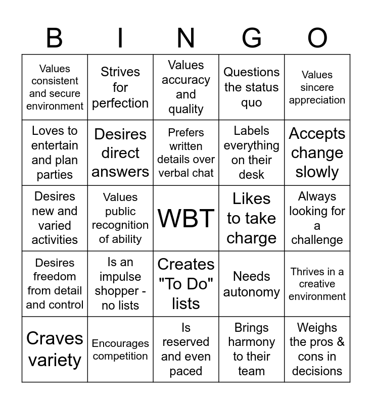 This bingo card has a free space and 24 words: Is an impulse shopper - no lists, Encourages competition, Prefers written details over verbal chat, Craves variety, Values sincere appreciation, Values consistent and secure environment, Loves to entertain and plan parties, Strives for perfection, Likes to take charge, Creates "To Do" lists, Labels everything on their desk, Desires new and varied activities, Needs autonomy, Thrives in a creative environment, Desires direct answers, Brings harmony to their team, Always looking for a challenge, Values accuracy and quality, Accepts change slowly, Values public recognition of ability, Weighs the pros & cons in decisions, Desires freedom from detail and control, Questions the status quo and Is reserved and even paced.