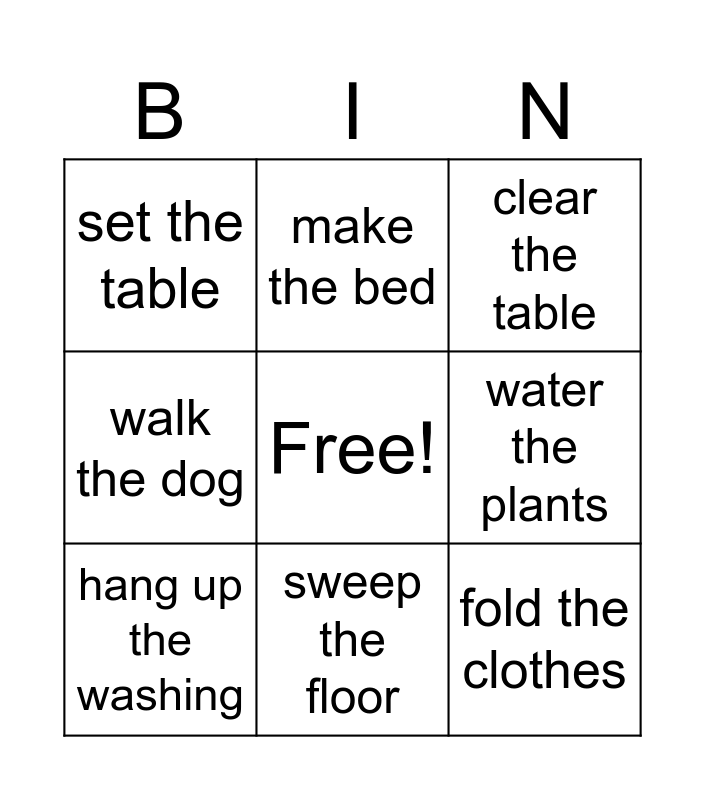 This bingo card has a free space and 8 words: water the plants, clear the table, make the bed, hang up the washing, set the table, fold the clothes, walk the dog and sweep the floor.